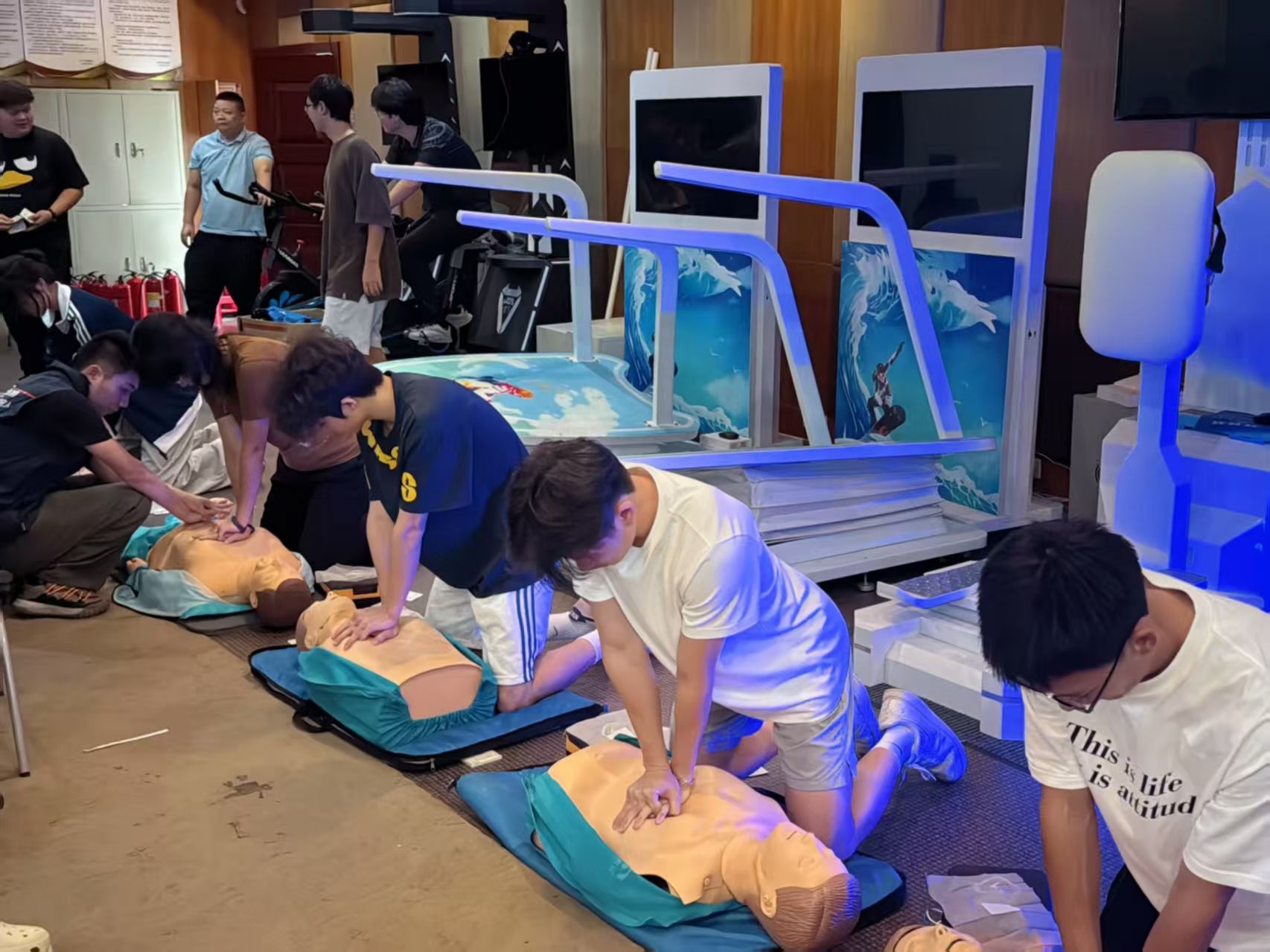 培训第一阶段聚焦“消防安全与个人防护”,教练不仅详细演示应急面罩、防护手套等装备的规范穿戴流程,并通过实物拆解,讲解不同类型灭火器的适用火灾场景、操作步骤及安全注意事项。随后,全体学员参与模拟灭火实操,在教练指导下反复练习 “提、拔、握、压” 动作;第二阶段转入“基础救援技术”教学,针对运动训练中常见的伤员转运需求,教练系统讲解基础理论,并组织学员分组开展伤员转运模拟演练,强化实操熟练度;最后阶段聚焦“医疗急救核心技能”,采用“理论讲解+示范教学+分组实操+纠错指导”的立体化模式。在心肺复苏与自动体外除颤器(AED)操作环节,教练先明确心脏骤停急救黄金4分钟的重要性,详解AED使用原理与操作步骤,再通过模拟人进行标准动作示范。学员分组实操时,教练逐人检查动作规范性,确保每位学员都能达到“流程完整、动作标准、处置高效”的要求。